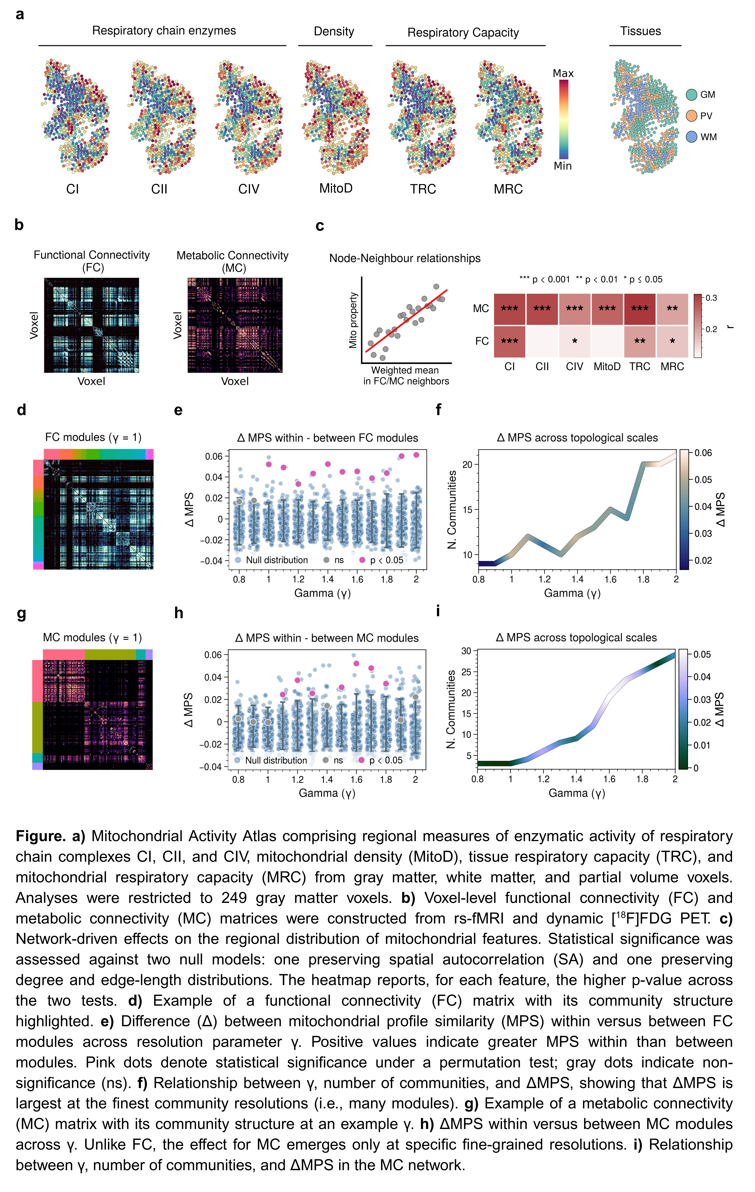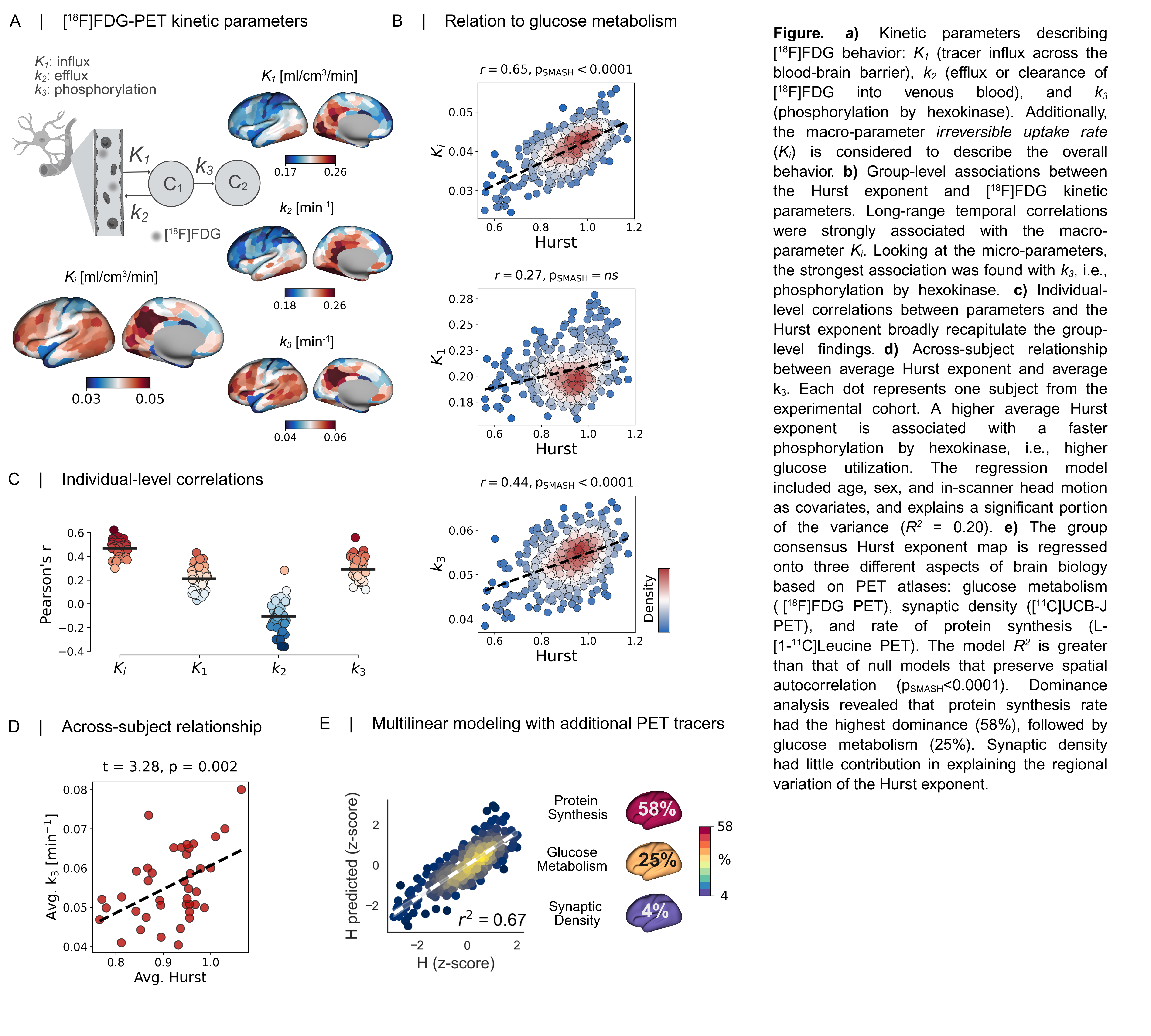 We analyzed a multimodal dataset comprising resting-state fMRI and dynamic [18F]FDG PET from 43 healthy adults. The Hurst exponent was estimated via a wavelet-based approach using the Schaefer 400 7 Networks atlas augmented with the Tian subcortical atlas (S1). Dynamic [18F]FDG PET was fitted with the two-compartment Sokoloff model to obtain microparameters K1 (tracer inflow), k2 (tracer efflux), and k3 (phosphorylation by hexokinase). The macroparameter Ki (net uptake) captured overall kinetics (Figure 1 panel a). We correlated the Hurst exponent with [18F]FDG parameters at group and individual levels, assessing significance with spatial-autocorrelation-preserving null models (Figure panels b-c). Interindividual variability was tested by regressing mean Hurst exponents against [18F]FDG parameters while controlling for age, sex, and head motion (Figure panel d). We further extended analyses to two PET tracers: [11C]UCB-J (synaptic density) and L-[1-11C]Leucine (cerebral protein synthesis rate, rCPS). The hurst exponent map was regressed onto these biological properties. Predictor importance was assessed by dominance analysis, and model performance was evaluated with distance-dependent cross-validation (Figure panel e).