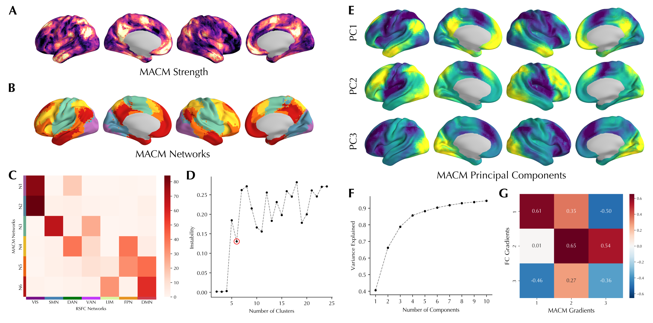 We quantified MACM strength as the overall meta-analytical co-activation rate, which was highest in frontal medial cortex, middle temporal gyrus, supplementary motor area, posterior cingulate and precuneus (Figure 1A). Next, we computed similarity of MACM patterns across all cortical vertices, resulting in the MACM$_{corr}$ matrix. Clustering analysis on MACM$_{corr}$ using K-means showed relatively stable solutions with 4, 6, 11, and 19 clusters (Figure 1C). We focused on the six-cluster solution (instability = 0.13, variance explained = 66.8%; Figure 1B), on par with the seven canonical RSFC networks (Yeo et al., 2011). There was a broad correspondence between the MACM and RSFC networks (Figure 1D), with some of the MACM networks aligning with single RSFC networks (e.g., N1 and N2 corresponding to the visual RSFC network), and some spanning multiple RSFC networks (e.g., N6 spanning limbic and default mode RSFC networks). Next, we applied principal component analysis on MACM$_{corr}$ and identified three principal axes that explained 79.5% of variance (Figure 1E,F). We found the first and second principal axes of MACM to be largely co-aligned with the first and second gradients of RSFC (Figure 1G).