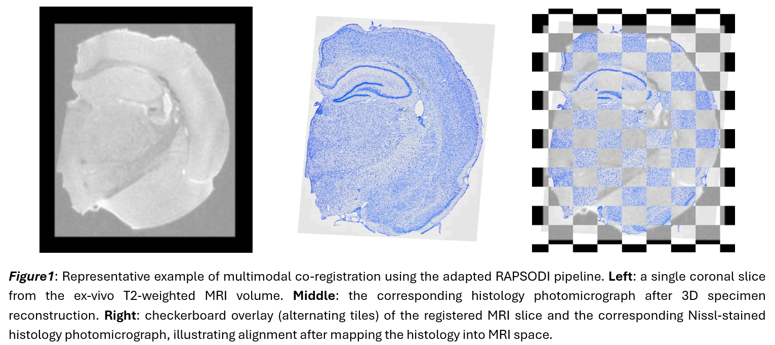 Conclusion: We present preliminary results for histology-MRI co-registration in rat brains. Future work will include a landmark-based evaluation and extend analysis beyond a single animal to the full cohort, reporting quantitative metrics alongside qualitative overlays.