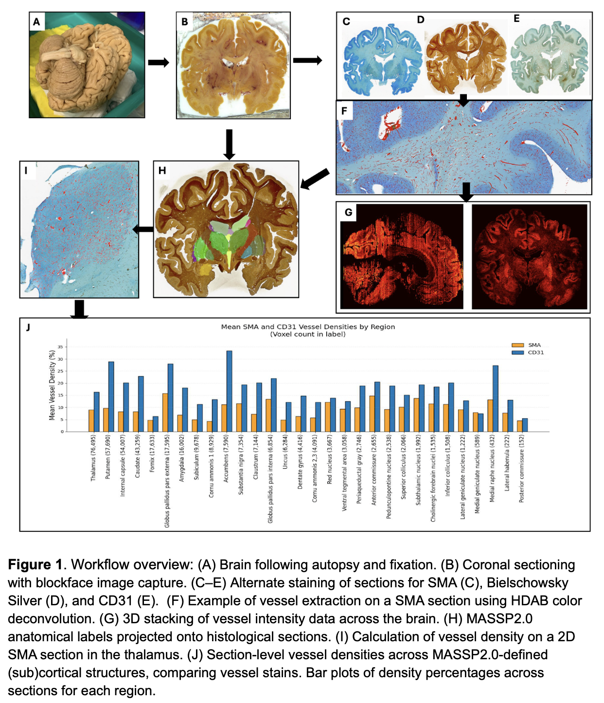 Methods: A healthy donor brain (male, 76y) was obtained through a whole-body donation program (Amsterdam UMC; Fig. 1A). After 10 % formalin perfusion fixation, quantitative MRI maps of longitudinal relaxation rate R1, transverse relaxation rate R2* and proton density were acquired at 400-μm and 200-250-μm isotropic resolution on a Magnetom 7T scanner (Max Planck Institute for Human Cognitive and Brain Sciences, Leipzig, Germany; Leiden UMC)³,⁴. The brain was then cryoprotected in sucrose, frozen in TissueTek, and coronally sectioned into 811 slices at 200 μm using a cryomacrotome (-16 °C). Blockface images were captured for MRI alignment and histology registration (Fig. 1B). Sections were stained alternately with CD31 (PECAM- 1), SMA (Smooth Muscle Actin), and Bielschowsky Silver to visualize the vascular bed and scanned at 21-μm in-plane resolution (Fig. 1C–E). Color deconvolution was performed in Python using scikit-image’s Hematoxylin+DAB matrix (Fig. 1F), followed by vessel extraction and 3D mapping using Nighres filtering (Fig. 1G).The MASSP2.0 algorithm was applied to parcellate 31 subcortical structures on the 3D blockface reconstruction³,⁵. Labels were projected onto the aligned histology stack to identify anatomical structures (Fig. 1H). Within each MASSP2.0-defined region, vessel extractions were performed and densities quantified (Fig. 1I). Additional microscopic assessments characterized vessel morphology in SMA- and CD31-stained sections.