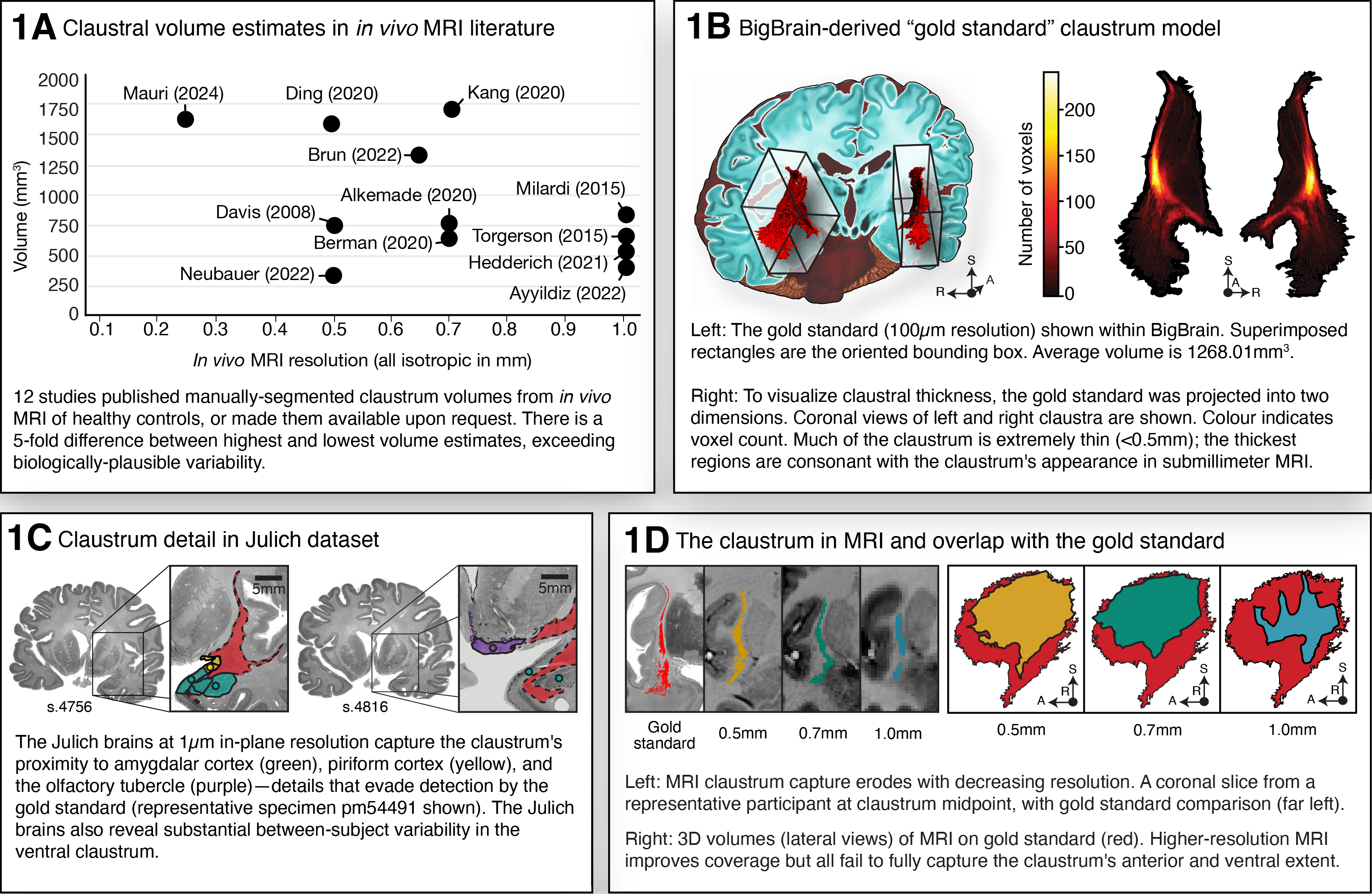 Fig 1C shows automated FreeSurfer volumetric parcellation output (wmparc.mgz) for BigBrain2 (150μm^3). mri_synthseg - now default in FreeSurfer v8.1 - unavoidably internally downsamples all input to 1mm. Therefore, all subcortical delineations shown are at 1mm^3. Only the cortical white / grey segmentations are refined by the surfaces extracted at 150μm^3.