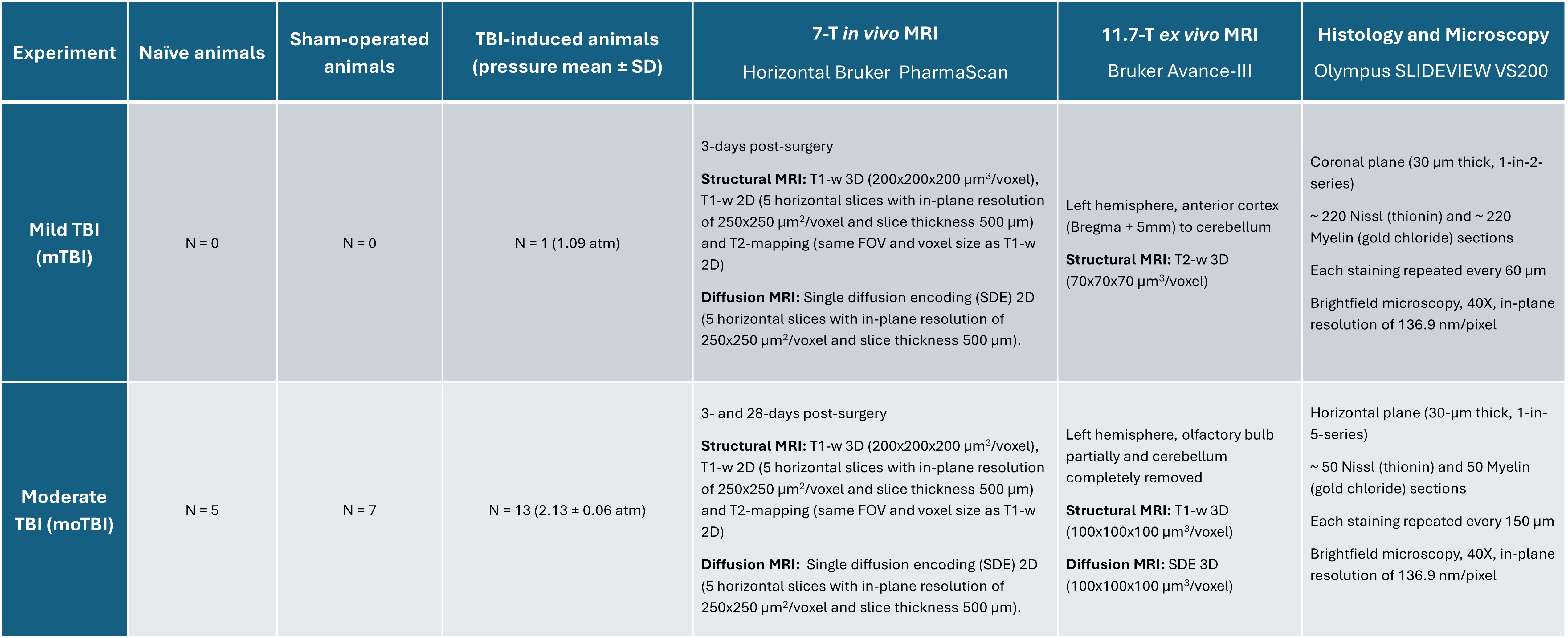 We tested this pipeline on the left hemisphere of four rats – one each of naïve, sham-operated, mild TBI (mTBI), and moderate TBI (moTBI) animals - from a larger dataset introduced in Table 1. Details of surgical procedures, lateral fluid percussion, and tissue processing are presented in [5]. We used the 11.7-T ex vivo MRI with T1-w and T2-w sequences (70-100 µm isotropic) and orientationally averaged diffusion image (150-µm isotropic) as the reference volume. We processed the Nissl- and myelin-stained sections to assess the cyto- and myeloarchitectonics. The stained sections were scanned at 136.9 nm/pixel in-plane, quality controlled, and downsampled to 10.95 µm. Histology photomicrographs and MRI images were masked, and the MRI volumes were re-oriented along the stacking axis of the corresponding histological object.