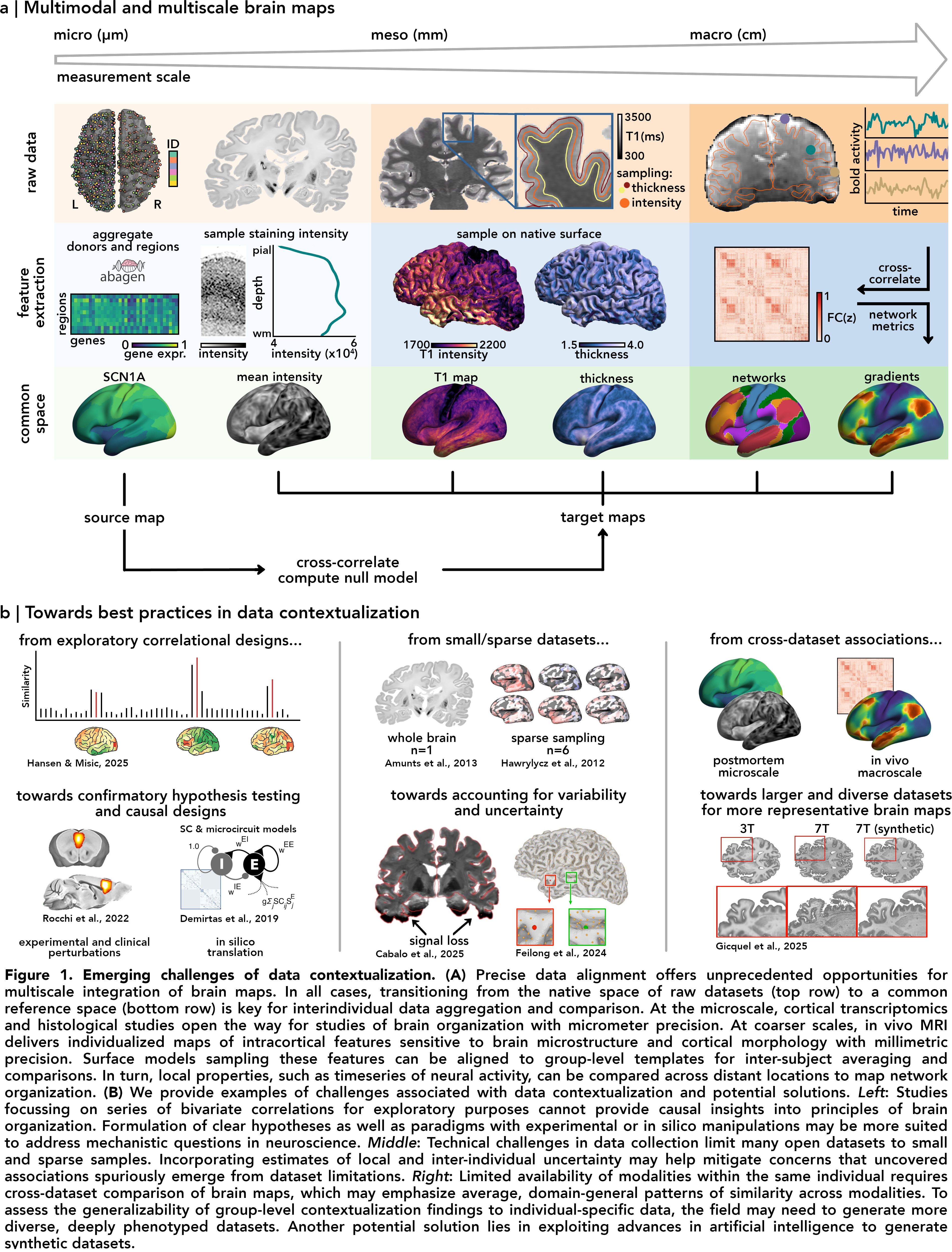 Understanding mechanisms of brain function and dysfunction is at the core of the neuroscience mission. However, our grasp of causal relationships between brain properties is hindered by a historical focus on single modalities neglecting the complex interplay between neural scales and features. Progress in neuroinformatics and the increasing availability of open datasets such as BigBrain have helped overcome this limitation by facilitating the contextualization of brain maps against cellular, metabolic, and network properties (Fig1A). Contextualization methods propose that quantifying spatial similarity between brain maps (or brain map correlations) may shed light on pathways of structure-function coupling, development, and disease.