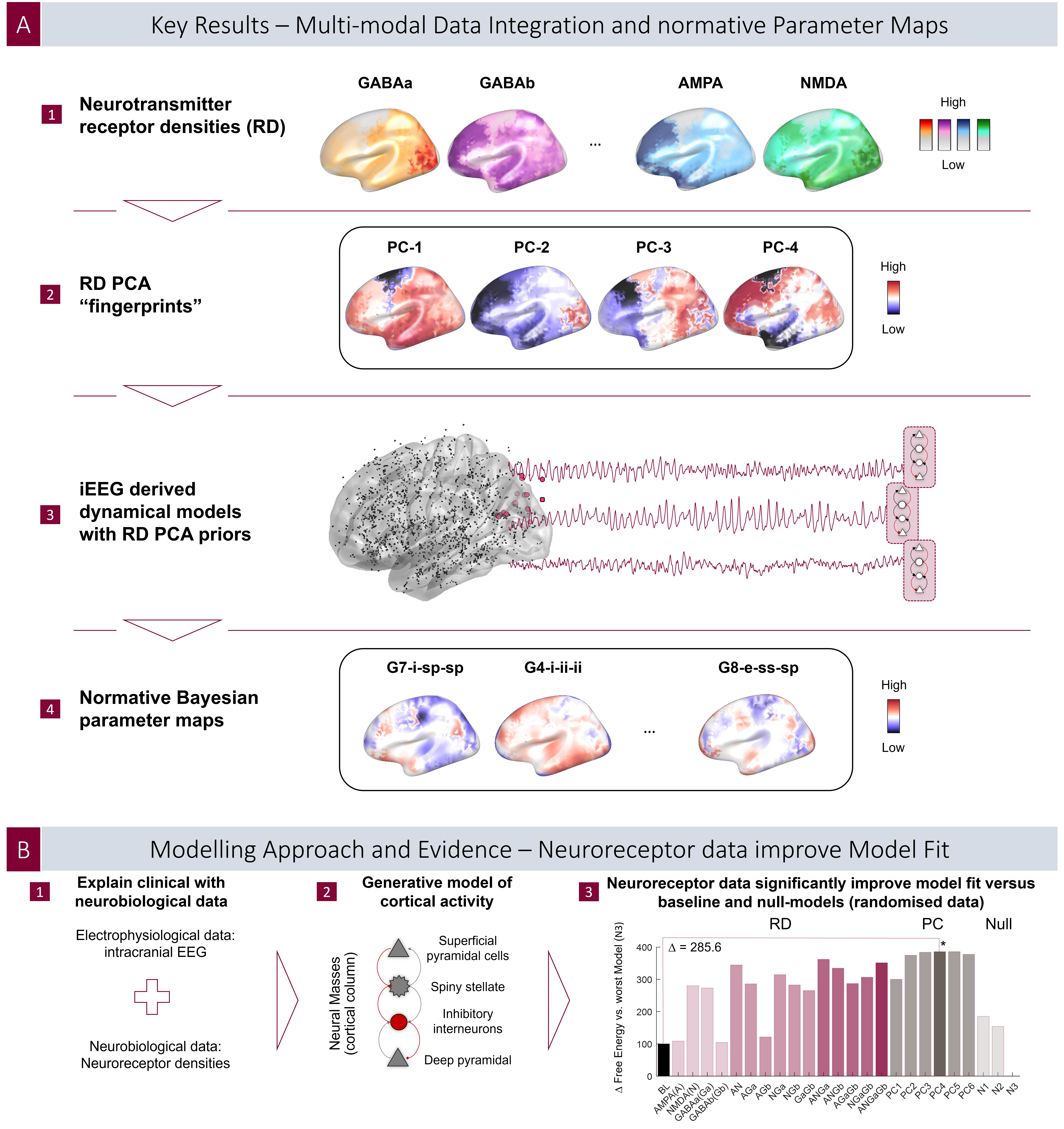 This study comprises three steps. First, we employed canonical microcircuit models (CMC) to generate iEEG spectra and obtain baseline fits. Subsequently, we investigated how regional receptor compositions (‘fingerprints’) explain variations in cortical electrophysiology; we leveraged a flexible parametric empirical Bayesian hierarchical approach to do this. The purpose of this step was to demonstrate how multi-modal data can be integrated to evaluate hypotheses and how generative models of neural populations can be enhanced by neurobiological priors. We obtained model evidence, which was used to determine a winning model, and neurobiologically-informed connectivity parameters. Eventually, normative parameters from the winning model were used in a worked-example of mismatch negativity to demonstrate how the derived parameter posteriors can serve as priors to facilitate optimisation and hypotheses testing.